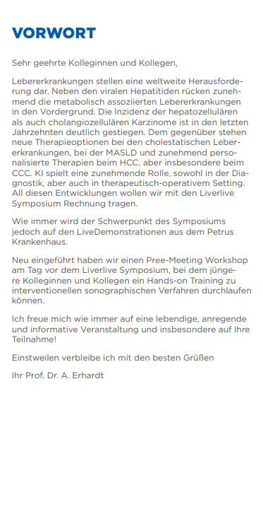 Lebererkrankungen stellen eine weltweite Herausforderung dar. Neben den viralen Hepatitiden rücken zunehmend die metabolisch assoziierten Lebererkrankungen in den Vordergrund. Die Inzidenz der hepatozellulären als auch cholangiozellulären Karzinome ist in den letzten Jahrzehnten deutlich gestiegen. Dem gegenüber stehen neue Therapieoptionen bei den cholestatischen Lebererkrankungen, bei der MASLD und zunehmend personalisierte Therapien beim HCC, aber insbesondere beim CCC. KI spielt eine zunehmende Rolle, sowohl in der Diagnostik, aber auch in therapeutisch-operativem Setting. All diesen Entwicklungen wollen wir mit den LiverLive Symposium Rechnung tragen. Wie immer wird der Schwerpunkt des Symposiums jedoch auf den Live-Demonstrationen aus dem Petrus Krankenhaus liegen.